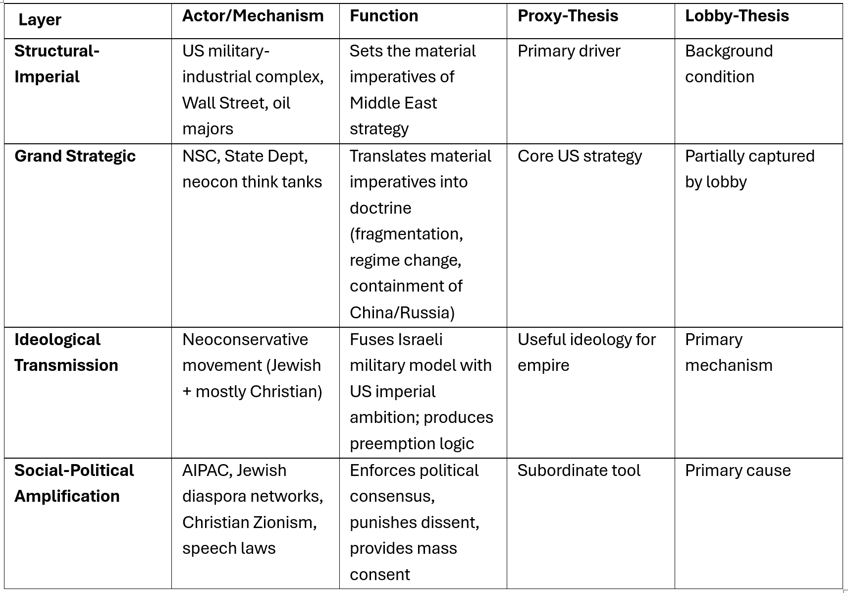 Re: "I want to offer a third, synthesizing position: Israel is a functionally radicalized proxy that has also served as an ideological and military-operational laboratory and role model for a specific faction of the US ruling strata (neoconservatism and securitocrats), producing a feedback loop in which US imperial strategy and Israeli state logic have become mutually constitutive."